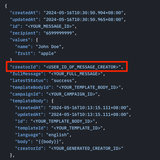 `"creatorId": "<USER_ID_OF_MESSAGE_CREATOR>"`